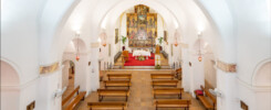 L’església es va començar a construir l’any 1786 i es va inaugurar el 1797. El seu exterior resulta particular per la distribució de la façana, amb un porxo integrat al volum de l’edifici.
